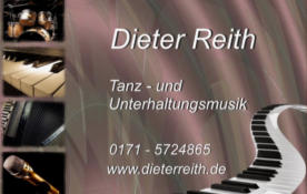 Hallo, mein Name ist Dieter Reith. Ich bin 1949 in Schwarmstedt geboren. Mit 12 Jahren habe ich angefangen Musik zu machen und bis heute hat mich die Leidenschaft nicht losgelassen. Anfangs haben wir uns zu dritt zusammen gefunden und mit primitivsten Instrumenten musiziert. 1965 hatten wir unseren ersten öffentlichen Auftritt. Angefangen habe ich mit dem Akkordeon, bin dann über Schlagzeug und Gitarre spielen zum Keyboard und Gesang gekommen. Im Laufe der Jahre habe ich in verschiedensten Bands musiziert und viele interessante Events spielen dürfen. Wie z.B. die Sonnenwendfeiern in Dänemark, In den 70iger Jahren haben wir im gesamten Landkreis Celle, vor allem aber in Wietze einen Karriereschub erhalten. Eröffnung des Waldstations, Einweihung der Sporthalle in Wietze, viele Schützenfeste im gesamten Landkreis und darüber hinaus, unzählige Tanztees, Mittel.- und Abschlußbälle, ebenso wie viele private Feiern. Gefühlt haben wir halb Wietze miteinander verheiratet. Eine großartige Zeit. Über die Jahre ergab es sich immer mal wieder, dass Bandmitglieder kamen und gingen, wobei neue interessante Konstellationen entstanden, (Hans, Wolfgang, Günther, Martin, Heinz, Edi, Pancrazio, Horst, Bernd (Keule), Jörg, Hans, Matze, Berndt, . . . ). Instrumente und Musikrichtungen variierten und die Auftritte fanden in halb Deutschland statt. Von Anfang an haben wir uns dem deutschen Schlager verschrieben, dem wir bis heute treu geblieben sind, wobei wir in den 80iger Jahren auch rockigere Musik gemacht haben. Auch heute noch machen wir Musik. Zu zweit, zu dritt oder auch alleine, gerade so wie es passt. Wir begleiten z.B. Goldene Hochzeiten, 70., 80., . . . Geburtstage, Jubiläen, . . . (Unterhaltungsmusik, Tischmusik) Aber auch Schützenfeste, Straßen- und Dorffeste, ebenso kleine und große Veranstaltungen aller Art.